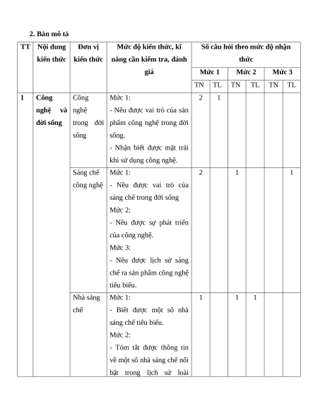 Công nghệ Công nghệ trong đời sống 2 1 2 1 30 và đời sống Sáng chế công nghệ 2 1 1 3 1 40 Nhà sáng chế 1 1 1 2 1 30 Tổng 5 1 2 1 1 7 3 Tỉ lệ (%) 60 % 30 % 10 % 100% 2. Bản mô tả TT Nội dung Đơn vị