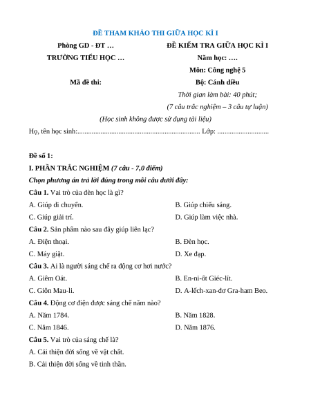 Bộ đề thi giữa kì 1 Công nghệ lớp 5 Cánh diều có đáp án