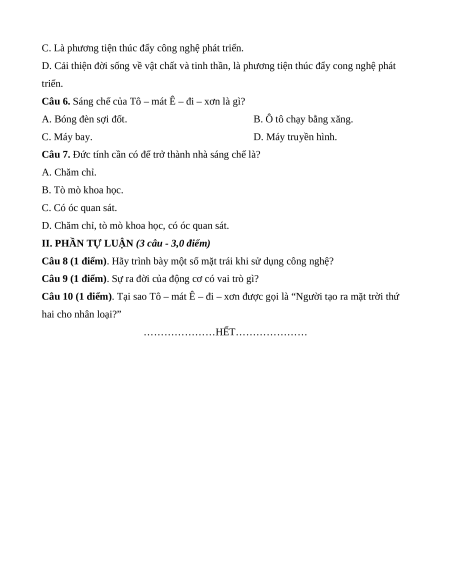 (7 câu trắc nghiệm – 3 câu tự luận)