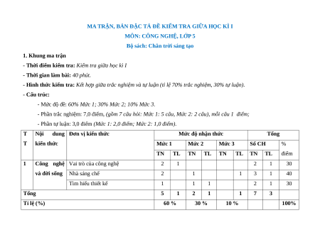 Công nghệ Vai trò của công nghệ 2 1 2 1 30 và đời sống Nhà sáng chế 2 1 1 3 1 40 Tìm hiểu thiết kế 1 1 1 2 1 30 Tổng 5 1 2 1 1 7 3 Tỉ lệ (%) 60 % 30 % 10 % 100% 2. Bản mô tả TT Nội dung Đơn vị