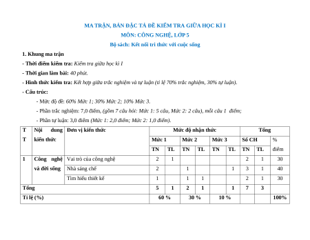 Công nghệ Vai trò của công nghệ 2 1 2 1 30 và đời sống Nhà sáng chế 2 1 1 3 1 40 Tìm hiểu thiết kế 1 1 1 2 1 30 Tổng 5 1 2 1 1 7 3 Tỉ lệ (%) 60 % 30 % 10 % 100% 2. Bản mô tả TT Nội dung Đơn vị