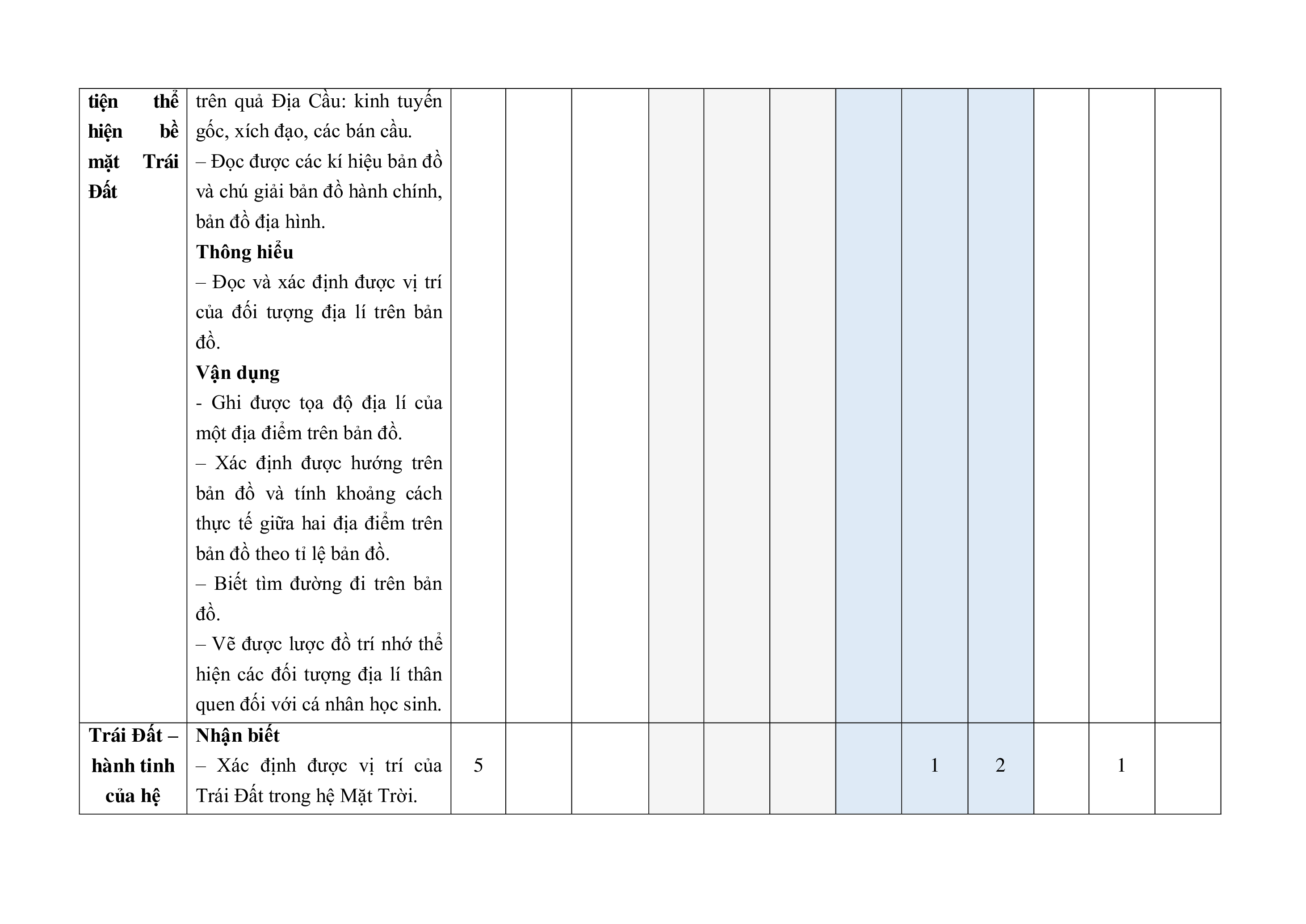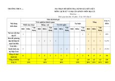tiện thể hiện bề 1 2 1 1 2 2 1 12,5% mặt Trái Đất Trái Đất – hành tinh của 5 1 2 1 5 2 2 27,5% hệ Mặt Trời Tổng số câu/ 6 1 2 1 1 1 2 1 1 8 4 4 16 lệnh hỏi Tổng số điểm 1,5 1,0 1,0 1,5 2.0 1,5 1,5 5,0 Tỉ lệ % 15% 10% 10% 15% 20% 15% 15% 50% TRƯỜNG THCS ....