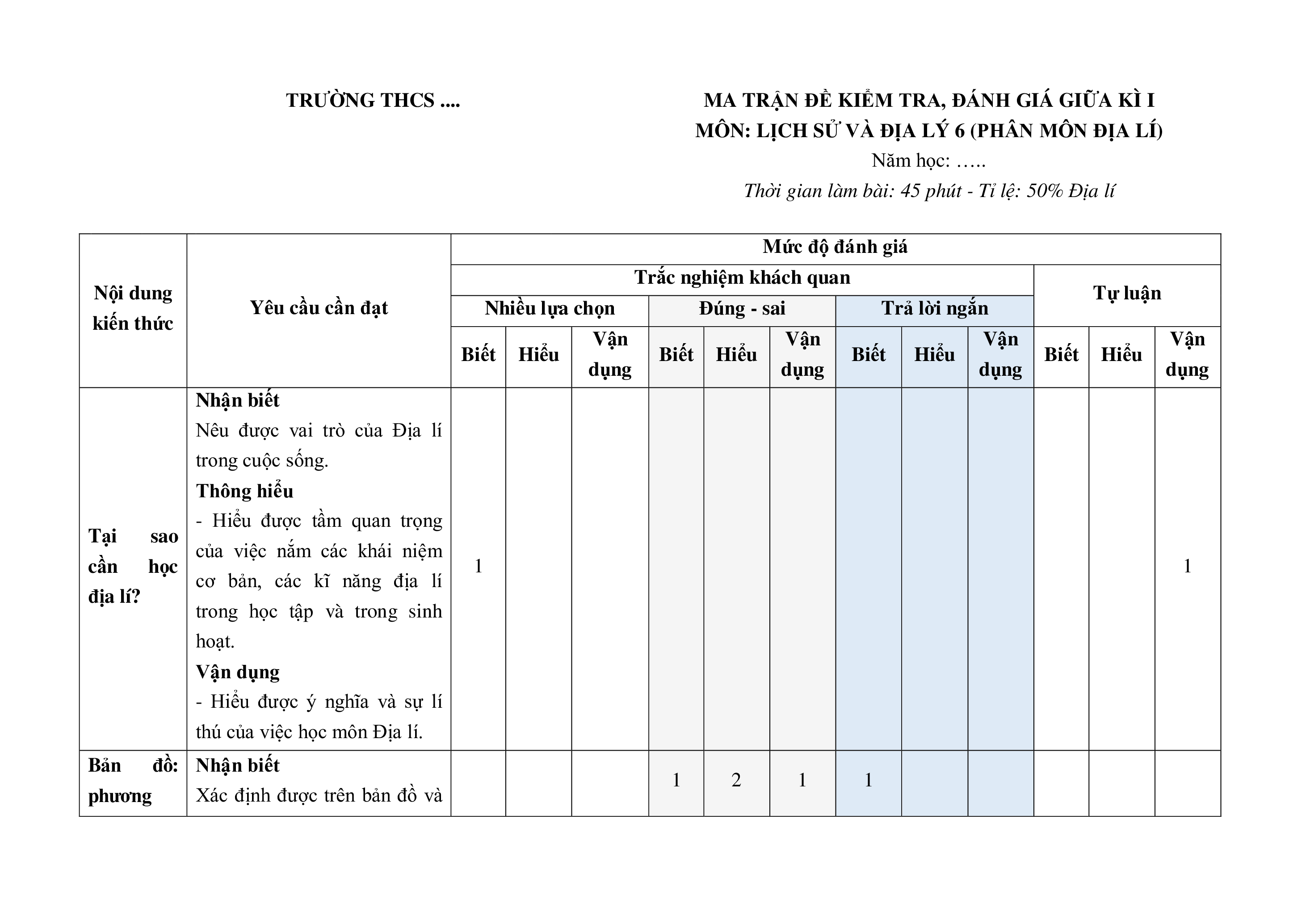 Trắc nghiệm khách quan Tổng Nội dung Tự luận điểm Nhiều lựa chọn Đúng - sai Trả lời ngắn kiến thức Vận Vận Vận Vận Vận Biết Hiểu Biết Hiểu Biết Hiểu Biết Hiểu Biết Hiểu dụng dụng dụng dụng dụng Tại sao cần học 1 1 1 1 10% địa lí? Bản đồ: phương