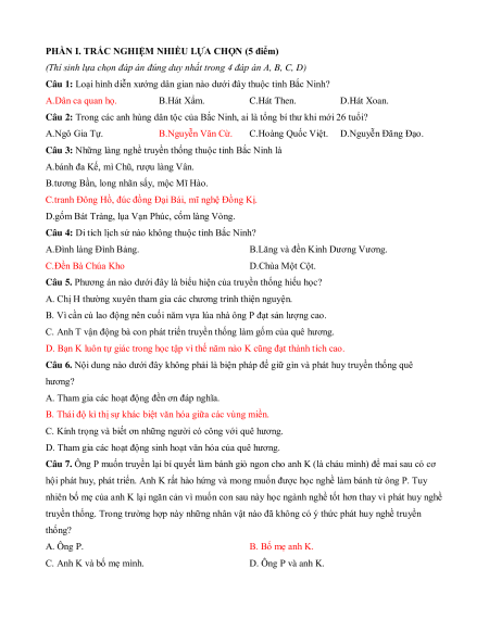 Câu 1: Loại hình diễn xướng dân gian nào dưới đây thuộc tỉnh Bắc Ninh? A.Dân ca quan họ. B.Hát Xẩm. C.Hát Then. D.Hát Xoan.