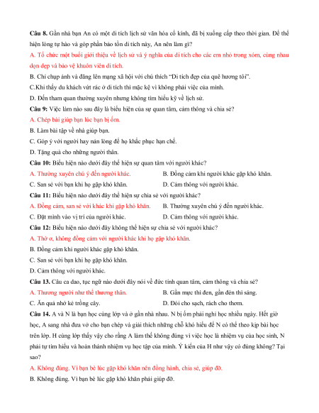 Câu 9: Việc làm nào sau đây là biểu hiện của sự quan tâm, cảm thông và chia sẻ?