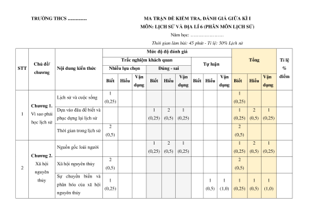 phục dựng lại lịch sử (0,25) (0,5) (0,25) (0,25) (0,5) (0,25) học lịch sử 2 2 Thời gian trong lịch sử (0,5) (0,5) 1 2 1 1 2 1 Nguồn gốc loài người (0,25) (0,5) (0,25) (0,25) (0,5) (0,25) Chương 2. 2 2 Xã hội Xã hội nguyên thủy 2 (0,5) (0,5) nguyên Sự chuyển biến và thủy 1 1 1 1 1 1 phân hóa của xã hội (0,25) (0,5) (1,0) (0,25) (0,5) (1,0) nguyên thủy