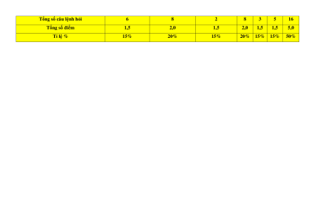 Tổng số câu lệnh hỏi 6 8 2 8 3 5 16 Tổng số điểm 1,5 2,0 1,5 2,0 1,5 1,5 5,0 Tỉ lệ % 15% 20% 15% 20% 15% 15% 50%