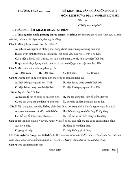 MÔN: LỊCH SỬ VÀ ĐỊA LÍ 6 (PHẦN LỊCH SỬ) Năm học: …………..