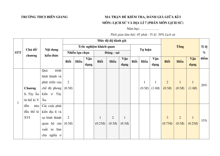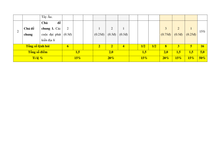 đầu thế kỉ kiến địa lí và XVI sự hình thành 2 1 2 1 3 2 1 15% quan hệ sản (0.5đ) (0.25đ) (0.5đ) (0.5đ) (0.75đ) (0.5đ) (0.25đ) xuất tư bản chủ nghĩa ở Tây Âu. Chủ đề Chủ đề chung 1. Các 2 1 2 1 3 2 1 2 15% chung cuộc đại phát (0.5đ) (0.25đ) (0.5đ) (0.5đ) (0.75đ) (0.5đ) (0.25đ) kiến địa lí