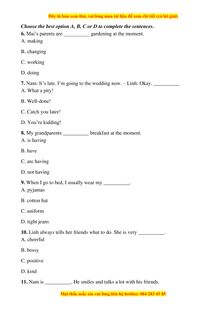 6. Mai’s parents are __________ gardening at the moment. A. making B. changing C. working D. doing