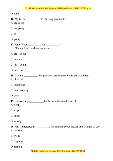 20. Mia is interested in __________. She can talk about dresses and T-shirts all day. A. uniform B. friend C. leggings D. fashion