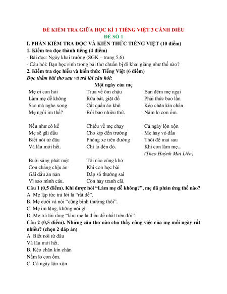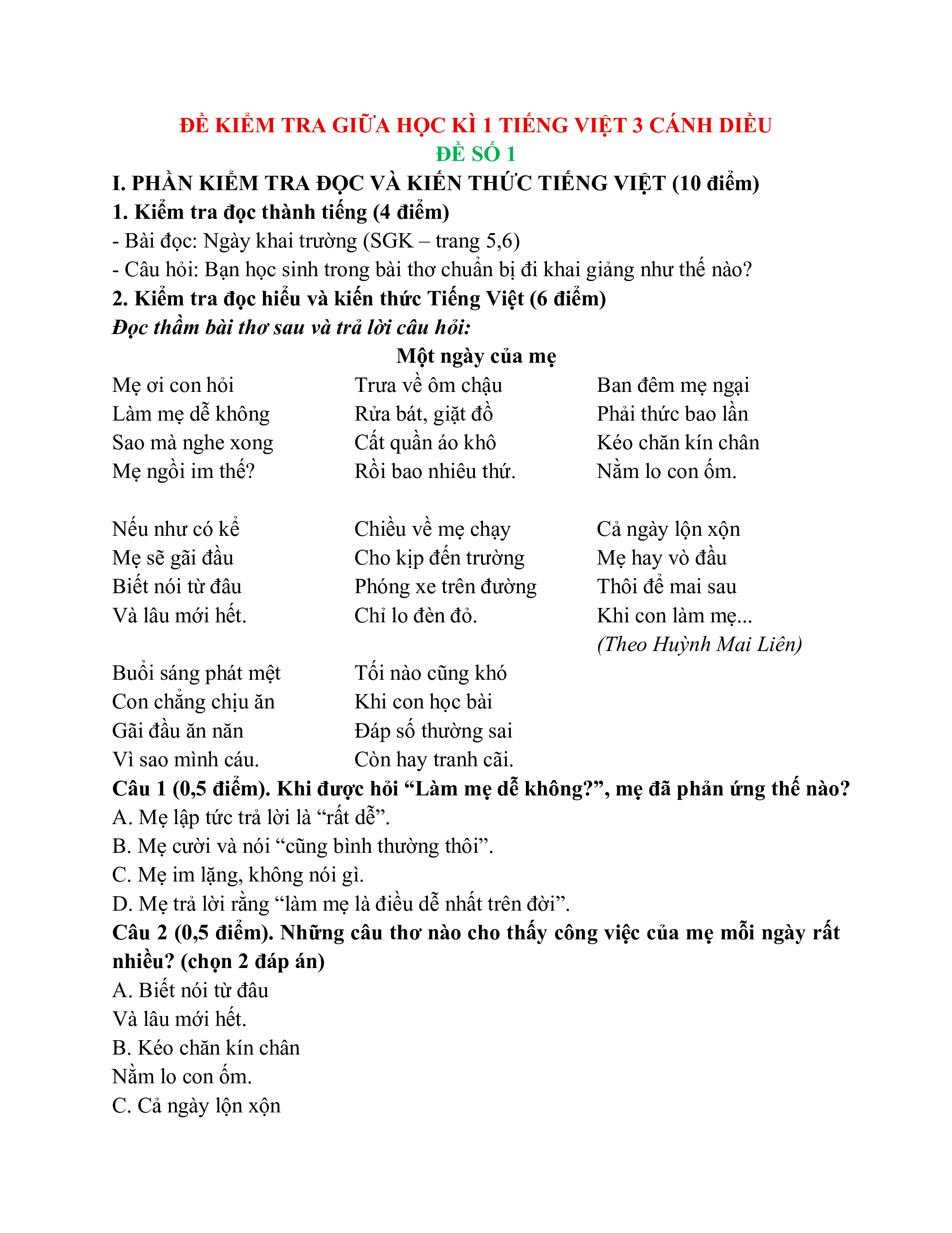 ĐỀ KIỂM TRA GIỮA HỌC KÌ 1 TIẾNG VIỆT 3 CÁNH DIỀU ĐỀ SỐ 1