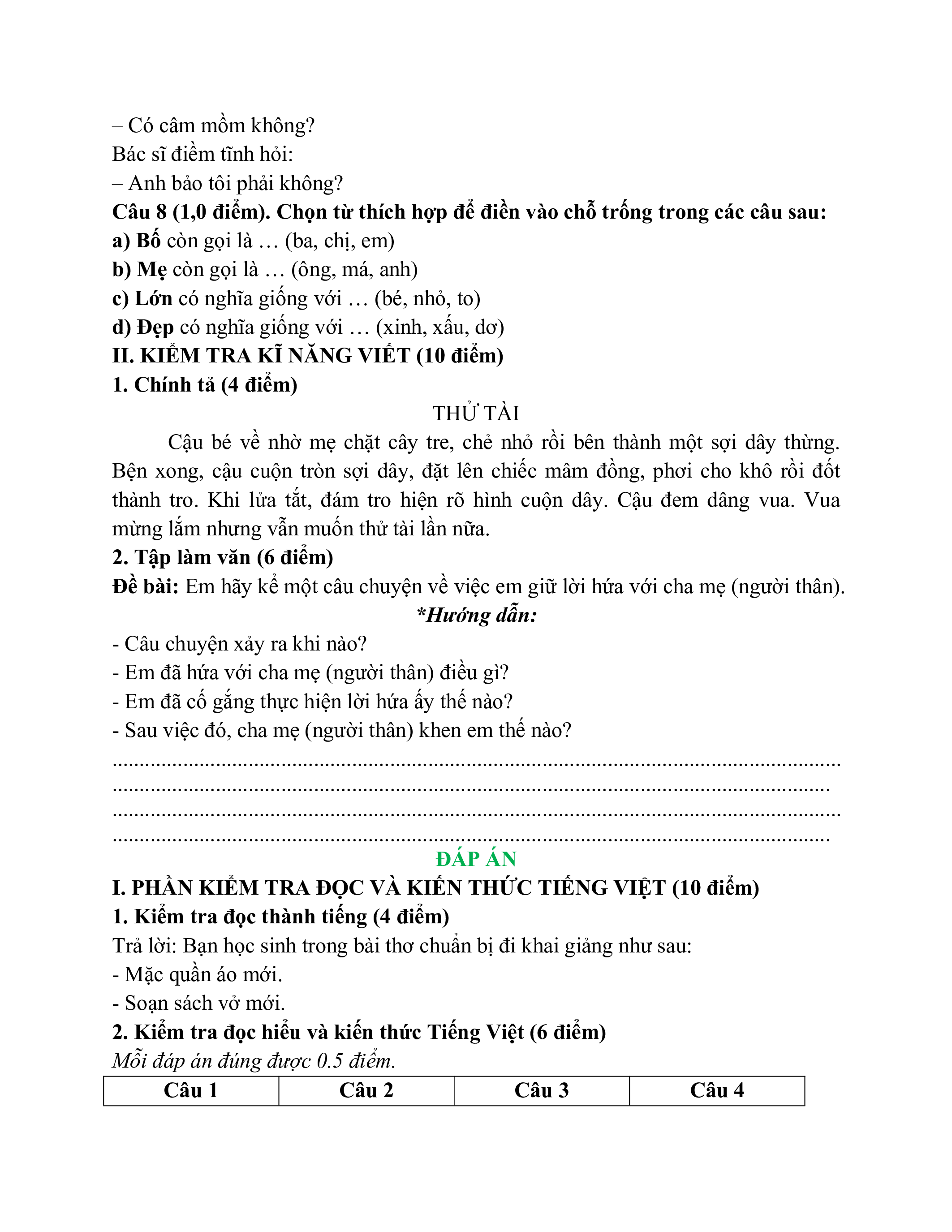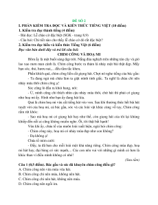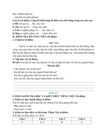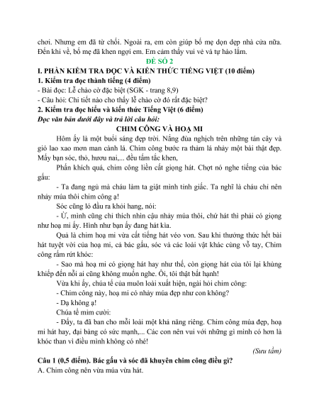 I. PHẦN KIỂM TRA ĐỌC VÀ KIẾN THỨC TIẾNG VIỆT (10 điểm)