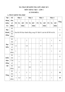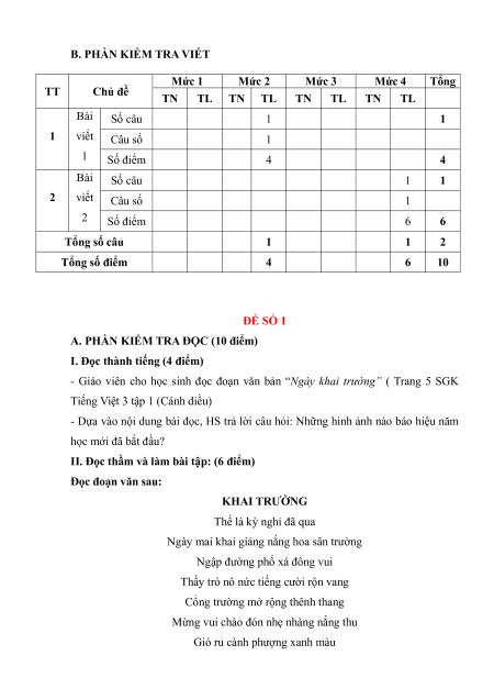 B. PHẦN KIỂM TRA VIẾT Mức 1 Mức 2 Mức 3 Mức 4 Tổng TT Chủ đề TN TL TN TL TN TL TN TL Bài Số câu 1 1 1 viết Câu số 1 1 Số điểm 4 4 Bài Số câu 1 1 2 viết Câu số 1 2 Số điểm 6 6 Tổng số câu 1 1 2 Tổng số điểm 4 6 10 ĐỀ SỐ 1