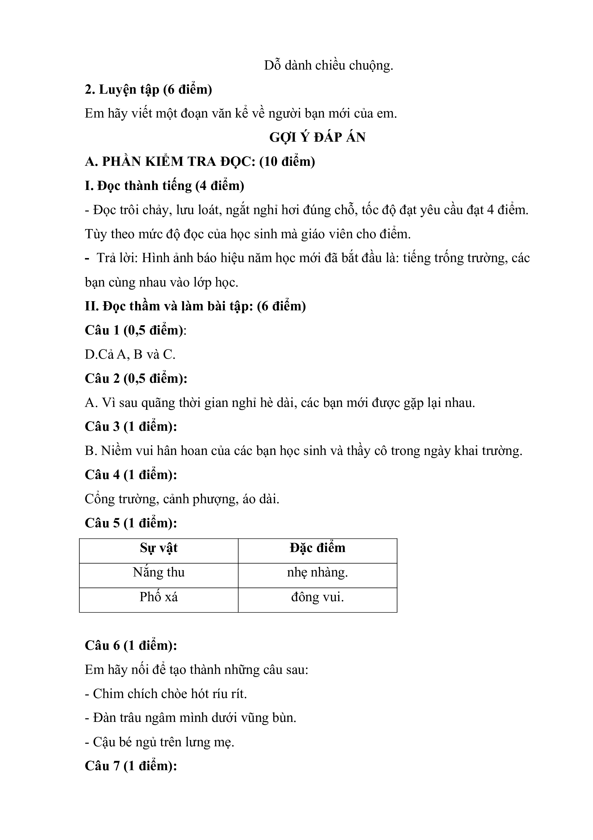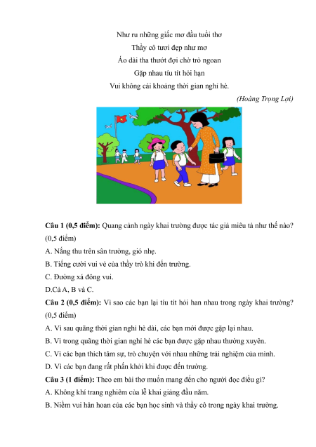 Câu 1 (0,5 điểm): Quang cảnh ngày khai trường được tác giả miêu tả như thế nào? (0,5 điểm)