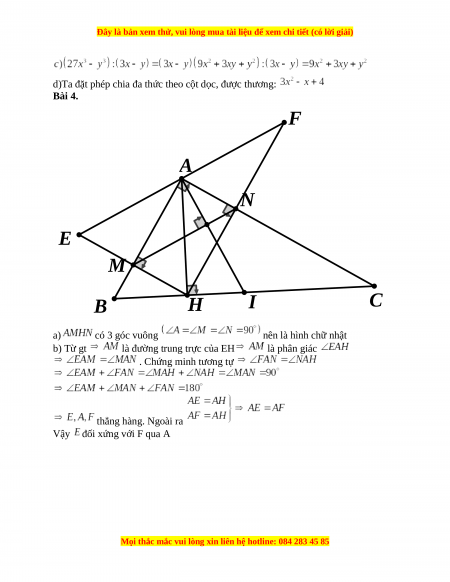 d)Ta đặt phép chia đa thức theo cột dọc, được thương: Bài 4. F A N E M B H I C a) có 3 góc vuông nên là hình chữ nhật b) Từ gt