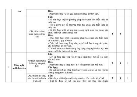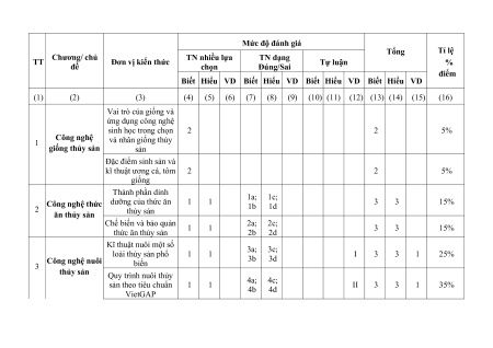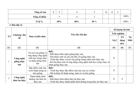 (9) (10) (11) (12) (13) (14) (15) (16) Vai trò của giống và ứng dụng công nghệ sinh học trong chọn 2 2 5% 1 Công nghệ và nhân giống thủy giống thủy sản sản Đặc điểm sinh sản và kĩ thuật ương cá, tôm 2 2 5% giống Thành phần dinh dưỡng của thức ăn 1 1 1a; 1c; 2 Công nghệ thức 1b 1d 3 3 15% ăn thủy sản thủy sản Chế biến và bảo quản 2c; thức ăn thủy sản 1 1 2a; 2b 2d 3 3 15% Kĩ thuật nuôi một số loài thủy sản phổ 1 1 3a; 3c; 3b 3d I 3 3 1 25% 3 Công nghệ nuôi biến thủy sản Quy trình nuôi thủy sản theo tiêu chuẩn 1 1 4a; 4c; VietGAP 4b 4d II 3 3 1 35% Tổng số câu 8 4 4 2 16 12 2 Tổng số điểm 3 4 3 100% Tỉ lệ % 30% 40% 30 % 100% 2. Bản đặc tả