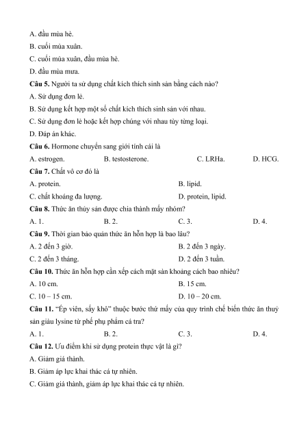 quản và chế biến thức 1 1 3a; 3c; 2 Công nghệ thức 3b 3d 3 3 15% ăn thủy sản ăn thủy sản Ứng dụng công nghệ sinh học trong bảo 4c; quản, chế biến thức 1 1 4a; 4b 4d 3 3 15% ăn thủy sản Công nghệ nuôi một số loài thủy sản phổ I 1 10% 3 Công nghệ nuôi thủy sản biến ở Việt Nam Nuôi thủy sản theo tiêu chuẩn VietGAP II 1 20% Tổng số câu 8 4 4 2 16 12 2 Tổng số điểm 3 4 3 100% Tỉ lệ % 30% 40% 30 % 100% 2. Bản đặc tả