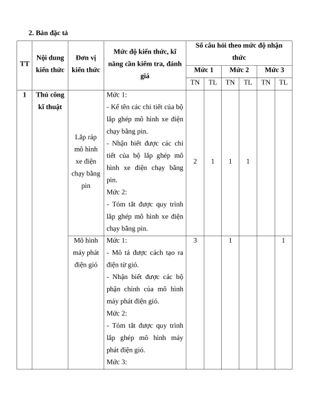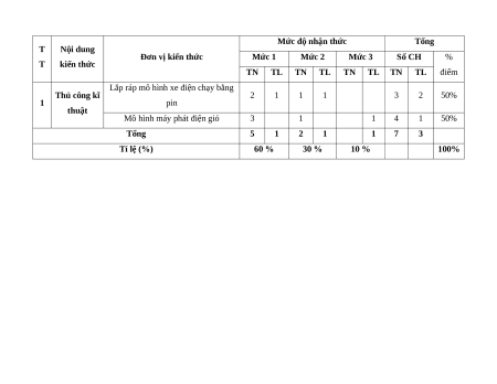 kiến thức kiến thức Mức 1 Mức 2 Mức 3 giá TN TL TN TL TN TL 1 Thủ công Mức 1: kĩ thuật