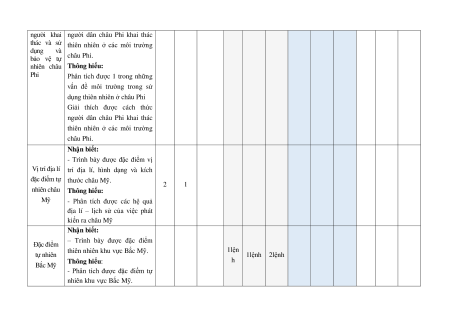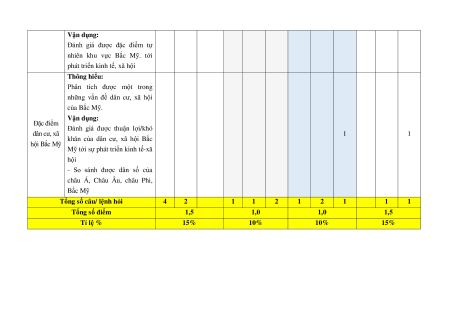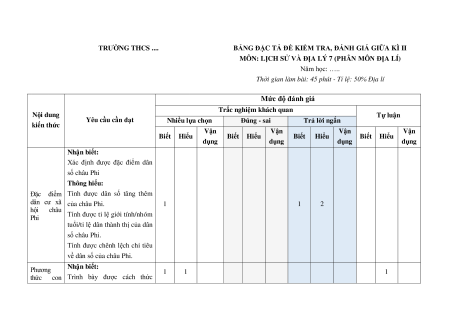 Trắc nghiệm khách quan Tổng % Nội dung Tự luận Nhiều lựa chọn Đúng - sai Trả lời ngắn điểm kiến thức Vận Vận Vận Vận Vận Biết Hiểu Biết Hiểu Biết Hiểu Biết Hiểu Biết Hiểu dụng dụng dụng dụng dụng Đặc điểm dân cư 10,0 1 1 2 2 2 xã hội châu Phi % Phương thức con người khai thác 17,5 và sử dụng và bảo 1 1 1 1 2 % vệ tự nhiên châu Phi Vị trí địa lí đặc điểm tự nhiên 2 1 2 1 7,5% châu Mỹ Đặc điể 1lện 10,0 m tự 1lệnh 2lệnh 1 1 2 nhiên Bắc Mỹ h % Đặc điểm dân cư, 1 1 2 5% xã hội Bắc Mỹ Tổng số câu/ 4 2 1 1 2 1 2 1 1 1 6 6 5 16 lệnh hỏi Tổng số điểm 1,5 1,0 1,0 1,5 1,5 2,25 1,25 5,0 22,5 12,5 Tỉ lệ % 15% 10% 10% 15% 15% 50% % % TRƯỜNG THCS ....