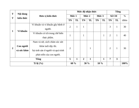 - Hình thức kiểm tra: Kết hợp giữa trắc nghiệm và tự luận (tỉ lệ 70% trắc nghiệm, 30% tự luận). - Cấu trúc: