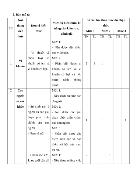 + Phần tự luận: 3,0 điểm (Mức 1: 2,0 điểm; Mức 2: 1,0 điểm).