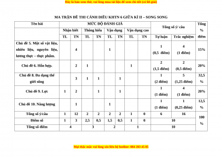 MA TRẬN ĐỀ THI CÁNH DIỀU KHTN 6 GIỮA KÌ II – SONG SONG