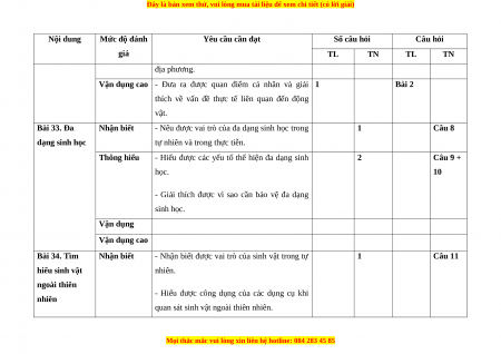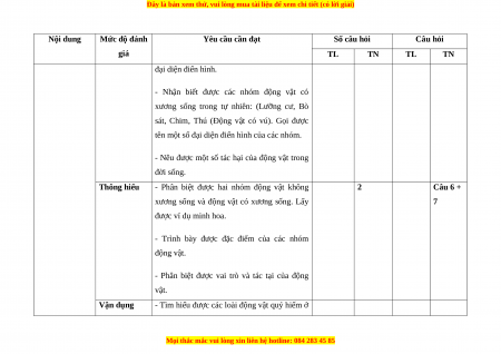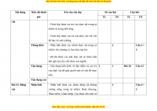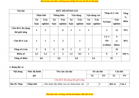 Chủ đề 8. Đa dạng 1 5 6 1 1 1 3 12 70% thế giới sống 2 ý/ 1 4 Chủ đề 9. Lực 1 1 1 2 1 câu (1 30% (2 điểm) điểm) Tổng số ý/câu 2 6 1 8 1 2 1 16 Điểm số 2,5 1,5 1 2 1,5 0,5 1 6 4 100 % Tổng số điểm 4,0 3,0 2,0 1,0 10 2. Bảng đặc tả Nội dung Mức độ đánh Yêu cầu cần đạt Số câu hỏi Câu hỏi giá TL TN TL TN