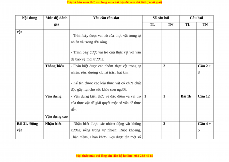 Note: TN: Lí 4 câu, Sinh: 12 câu; TL: Lí 2 điểm, Sinh 4 điểm