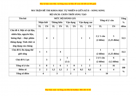 MA TRẬN ĐỀ THI KHOA HỌC TỰ NHIÊN 6 GIỮA KÌ II – SONG SONG