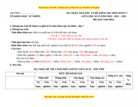 MA TRẬN ĐỀ THI CÁNH DIỀU KHTN7 GIỮA KÌ II – NỐI TIẾP