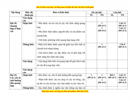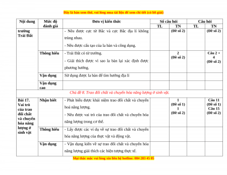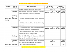 và chuyển hóa năng lượng 1 7 0 2 3 1 3 12 70 ở sinh vật. Tổng số ý/câu 1 8 1 4 1 4 1 0 4 16 Điểm số 2,0 2,0 2,0 1,0 1 1,0 1,0 0 6 4 100 % Tổng số điểm 4,0 3,0 2,0 1,0 10 2. Bảng đặc tả Nội dung Mức độ