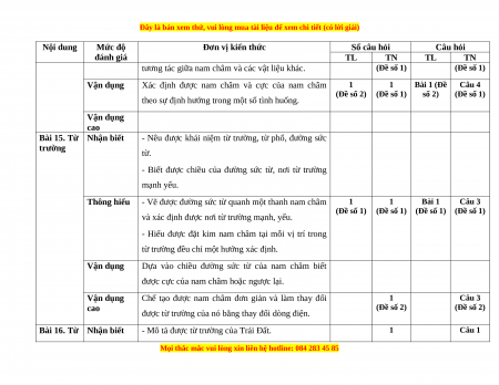 1. Khung ma trận đề kiểm tra giữa kì II môn Khoa học tự nhiên - lớp 7 a. Khung ma trận