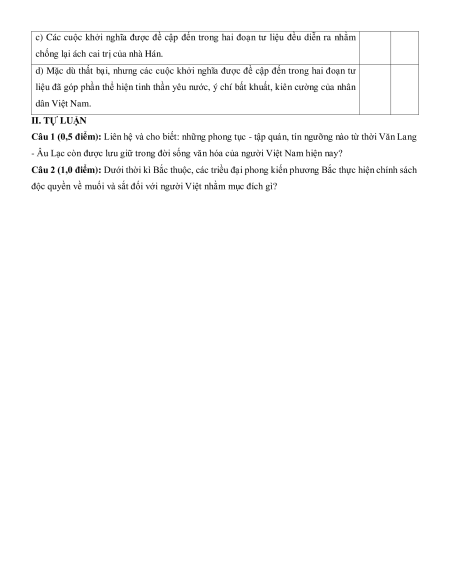Câu 1 (0,5 điểm): Liên hệ và cho biết: những phong tục - tập quán, tín ngưỡng nào từ thời Văn Lang