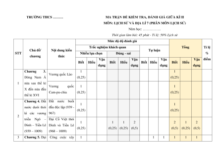 Trắc nghiệm khách quan Tổng Tỉ lệ Chủ đề/ Nội dung kiến Tự luận STT Nhiều lựa chọn Đúng - sai % chương thức Vận Vận Vận Vận điểm Biết Hiểu Biết Hiểu Biết Hiểu Biết Hiểu dụng dụng dụng dụng Chương 3. 1 1 Vương quốc Lào Đông Nam Á (0,25) (0,25) 1 nửa sau thế kỉ Vương quốc 1 1 X đến nửa đầu Cam-pu-chia (0,25) (0,25) thế kỉ XVI