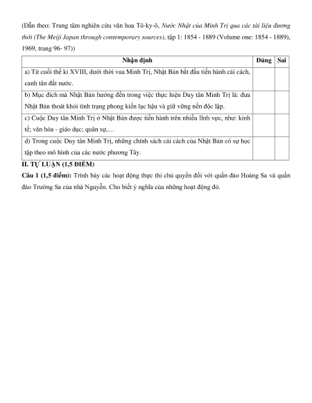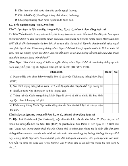 Câu 7: Đọc đoạn tư liệu sau đây, trong mỗi ý a), b), c), d), thí sinh chọn đúng hoặc sai.