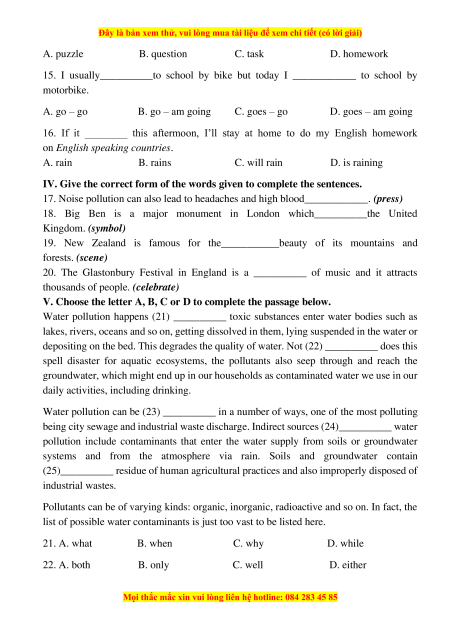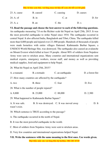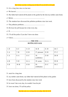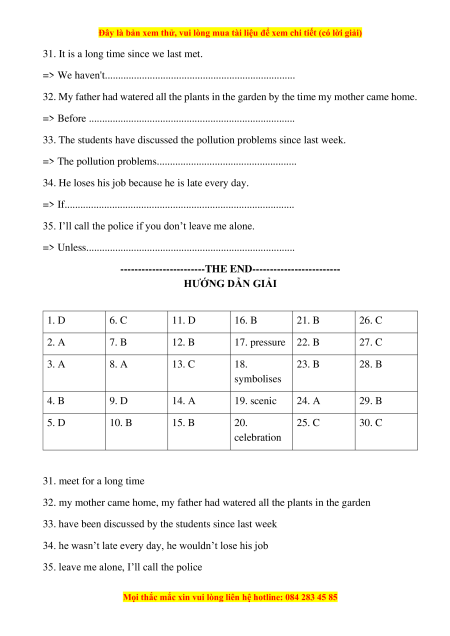 ------------------------THE END------------------------- HƯỚNG DẪN GIẢI 1. D 6. C 11. D 16. B 21. B 26. C 2. A 7. B 12. B 17. pressure 22. B 27. C 3. A 8. A 13. C 18. 23. B 28. B symbolises 4. B 9. D 14. A 19. scenic 24. A 29. B 5. D 10. B 15. B 20. 25. C 30. C celebration 31. meet for a long time