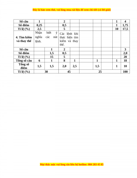 4. Tìm kiếm nghĩa các nút thực hiện tìm và thay thế lệnh. kiếm và thay thế. Số câu 1 2 3 Số điểm 1,5 0,5 2,0 Tỉ lệ (%) 15 5 20 Tổng số câu 6 1 8 1 1 1 18 Tổng số 1,5 1,5 2,0 2,5 1,5 1 10 điểm Tỉ lệ (%) 30 45 25 100