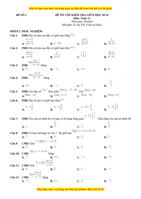 ĐỀ ÔN TẬP KIỂM TRA GIỮA HỌC KÌ II Môn: Toán 11 Thời gian: 90 phút