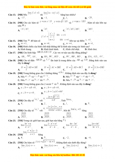 Câu 14. [NB] Cho các hàm số , và . Hàm số nào liên tục trên ? A. . B. . C. . D. . Câu 15. [NB] Tìm để hàm số liên tục tại điểm . A. . B. . C. . D. .