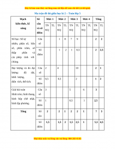 Ma trận đề thi giữa học kì 2 – Toán lớp 5 Mạch Số Mức 1 Mức 2 Mức 3 Mức 4 Tổng kiến thức, kĩ câu TN TL TN TL TN TL TN TL TN TL năng và số KQ KQ KQ KQ KQ điểm Số học: Số tự Câu 1 8 7 9 2 2 nhiên, phân số, hỗn số số, phần trăm, số Số 1 2 1 0,5 2 2,5 thập phân và điểm các phép tính với chúng. Đại lượng và đo đại Câu 2 4 10 2 1 lượng: độ dài, số khối lượng, Số 0,5 0,5 2 1 2 diện tích, thể tích. điểm Giải bài toán Câu 3 5 6 3 Hình tròn, hình thang, số hình hộp chữ nhật, Số 1 0,5 1 2,5 hình lập phương. điểm Tổng Số 2 2 1 2 2 1 7 3 câu Số 1,5 1,5 2 1,5 2,5 1 5,5 4,5 điểm