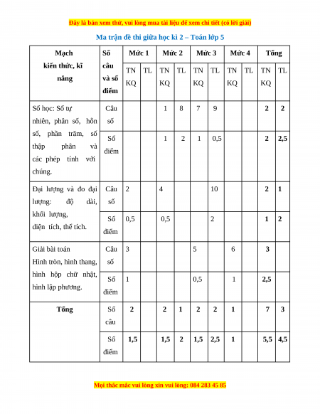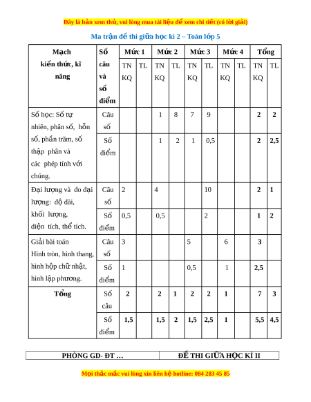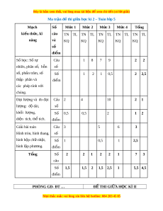ọ kì 2 – Toán l p 5 ớ Mạch Số Mức 1 Mức 2 Mức 3 Mức 4 T ng ổ ki n t ế h c, kĩ ứ câu TN TL TN TL TN TL TN TL TN TL năng và KQ KQ KQ KQ KQ số đi m ể Số h c: ọ Số tự Câu 1 8 7 9 2 2 nhiên, phân số, hỗn số số, phần trăm, số Số 1 2 1 0,5 2 2,5 th p ậ phân và đi m ể các phép tính v i ớ chúng. Đ i ạ lư ng ợ và đo đ i ạ Câu 2 4 10 2 1 lư ng: ợ độ dài, số khối lư ng, ợ Số 0,5 0,5 2 1 2 diện tích, th t ể ích. đi m ể Gi i ả bài toán Câu 3 5 6 3 Hình tròn, hình thang, số hình h p ch ộ nh ữ t ậ , Số 1 0,5 1 2,5 hình l p ph ậ ư ng. ơ đi m ể T ng ổ Số 2 2 1 2 2 1 7 3 câu Số 1,5 1,5 2 1,5 2,5 1 5,5 4,5 đi m ể PHÒNG GD- ĐT … ĐỀ THI GIỮA H C Ọ KÌ II M i