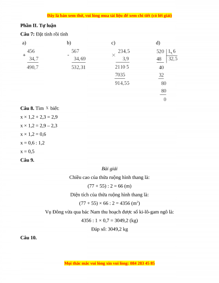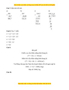 a) 456 + 34,7 b) 567 – 34,69 c) 234,5 × 3,9 d) 52 : 1,6 Câu 8. Tìm x bi t ế : x × 1,2 + 2,3 = 2,9 M i