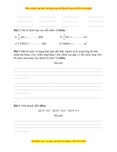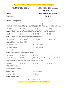 Câu 4. 2,3 gi = ..... gi ờ ờ ... phút? A. 2 giờ 18 phút B. 2 gi 30 phút ờ C. 2 gi 3 phút ờ D. 2 gi 36 phút ờ 32 Câu 5. 100 vi t ế dư i ớ d ng ạ s t ố h p phân l ậ à A. 0,0032 B. 0,032 C. 0,32 D. 3,2 Câu 6. M t ộ l p h ớ c ọ có 36 h c s ọ inh, trong đó có 9 h c ọ sinh đư c ợ x p l ế o i ạ gi i ỏ . T s ỉ ố phần trăm c a s ủ ố h c ọ sinh gi i ỏ so v i ớ s h ố c s ọ inh c l ả p. ớ A. 25 % B. 30 % C. 35 % D. 40 % Phần II. T l ự u n ậ Câu 7: Đ t ặ tính r i ồ tính