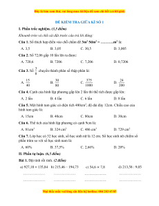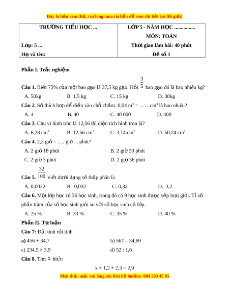 ờ gian làm bài: 40 phút Họ và tên: Đ s ề ố 1 Phần I. Tr c nghi ắ m ệ 3 Câu 1. Bi t ế 75% c a ủ m t ộ bao g o ạ là 37,5 kg g o. H ạ i ỏ 5 bao g o ạ đó là bao nhiêu kg? A. 50kg B. 1,5 kg C. 15 kg D. 30kg
