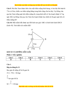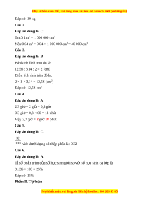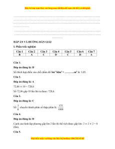 ở hình tam giác ABE và hình bình hành EBCD (hình v ) ẽ . Tính di n t ệ ích m nh đ ả t ấ ? ĐÁP ÁN VÀ HƯ N Ớ G D N Ẫ GI I Ả Phần I. Tr c nghi ắ m ệ Câu 1 Câu 2 Câu 3 Câu 4 Câu 5 Câu 6 D C B A C A Câu 1. Đáp án đúng là: D Bao g o đó n ạ ng ặ s ki ố -lô-gam là: 37,5 : 75% = 50 (kg) 3 5 bao g o ạ đó là: 3 50 × 5 = 30 (kg) M i
