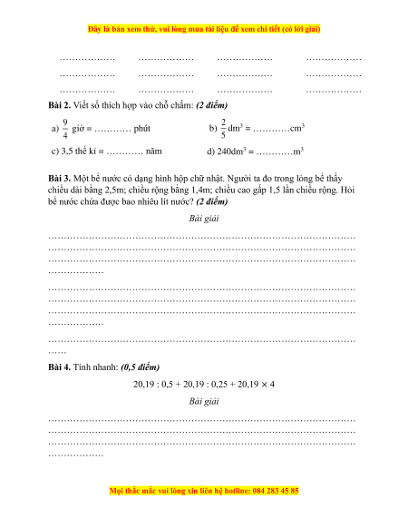 Bài 2. Viết số thích hợp vào chỗ chấm: (2 điểm) 9 2 a) giờ = ………… phút b) dm3 = …………cm3 4 5