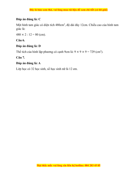 Câu 5. Một hình tam giác có diện tích 480cm2, độ dài đáy 12cm. Chiều cao của hình tam giác là: A. 15cm B. 40cm C. 80cm D. 30cm