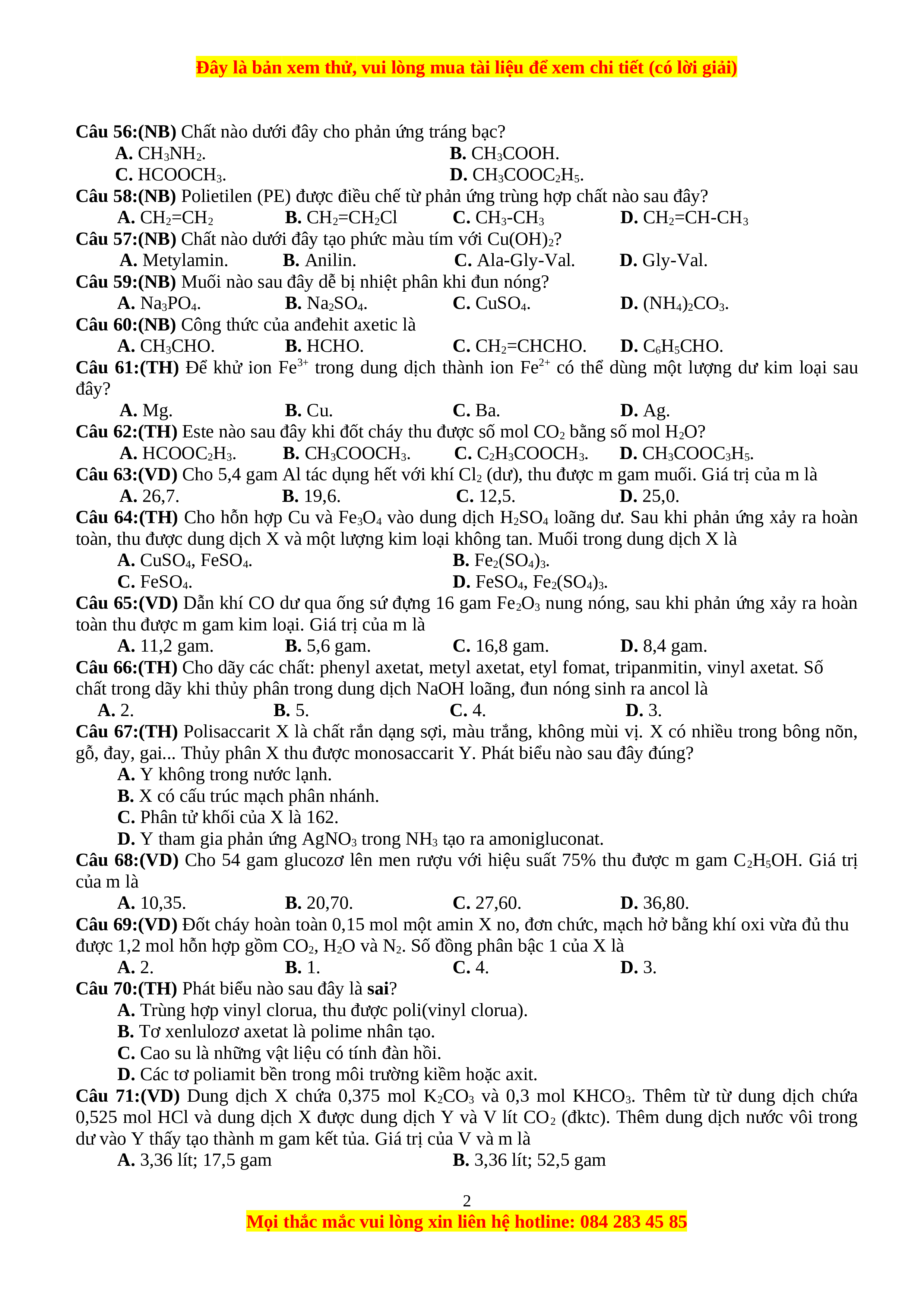 Câu 57:(NB) Chất nào dưới đây tạo phức màu tím với Cu(OH)2? A. Metylamin. B. Anilin. C. Ala-Gly-Val. D. Gly-Val.