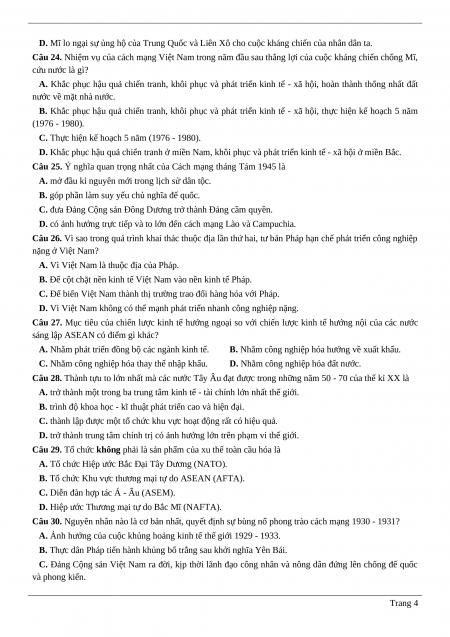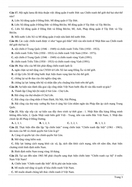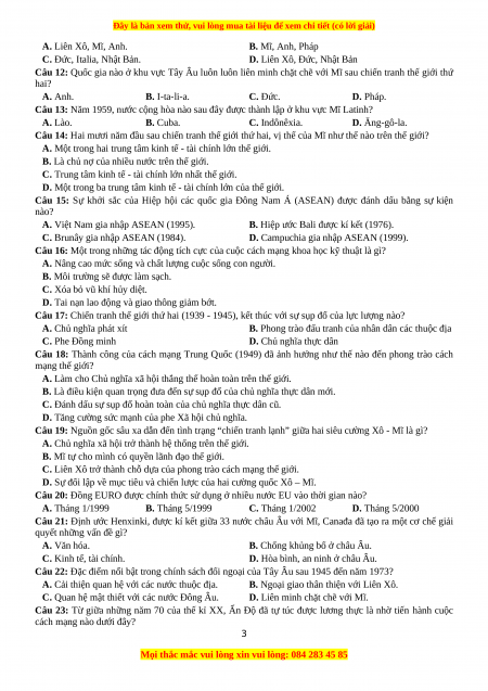 Câu 12: Quốc gia nào ở khu vực Tây Âu luôn luôn liên minh chặt chẽ với Mĩ sau chiến tranh thế giới thứ hai? A. Anh. B. I-ta-li-a. C. Đức. D. Pháp.